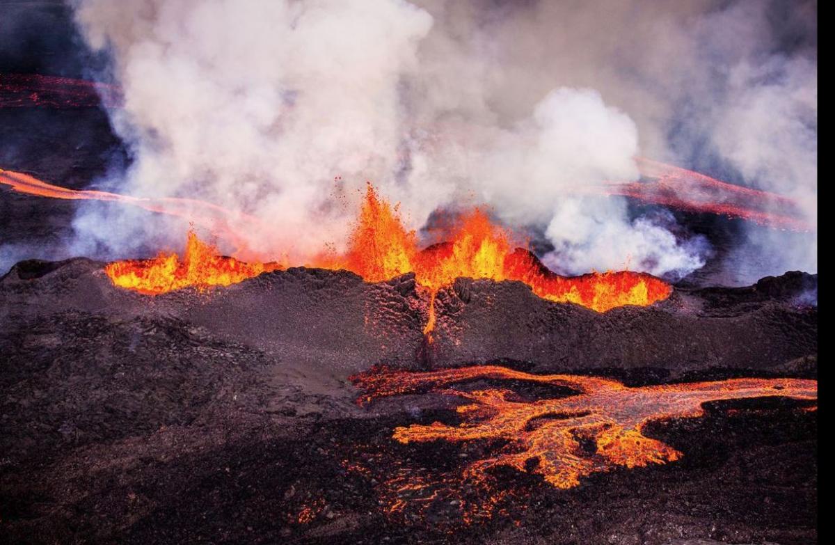 Bárðarbunga (bowr-thar-buhn-ga), one of Iceland’s most productive volcanoes, began an eruption in late August and has not stopped yet (4th week of October). Since the lava arrived on the earth’s surface through a crack in an old lava field called Holuhraun (ho-lu-hroin), it is often called the Holuhraun eruption. Bárðarbunga has a large crater deep under Iceland’s biggest ice cap and fissure fields running both north and south. It has erupted in both directions in the past, but it is far from populated areas so its history is better known through modern scientific studies than eyewitness accounts.